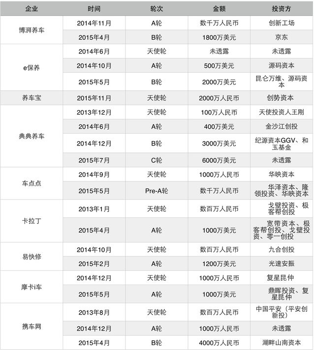 2015年上半年,養(yǎng)護O2O作為轎車后商場O2O的一個細分范疇也逐步升溫,包含博湃養(yǎng)車、典典養(yǎng)車、卡拉丁等在內(nèi)的多家公司都取得了新一輪融資。